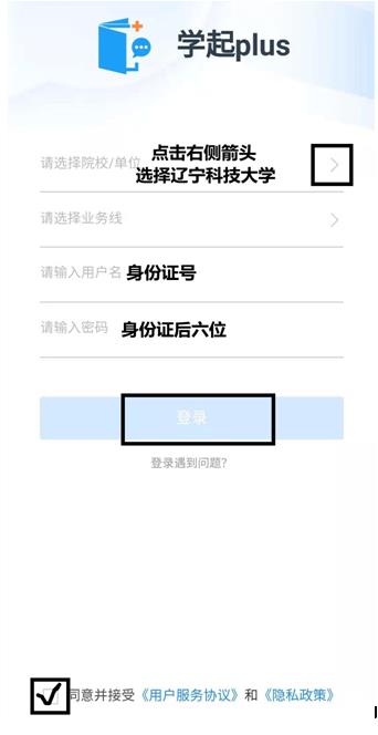 2、進入app后,選擇遼寧科技大學,輸入用戶名、密碼,并同意政策