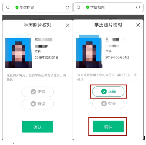 確認(rèn)無誤后,點(diǎn)擊 學(xué)歷照片還未校對。