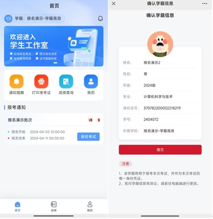 1、考生初次登錄報名系統(tǒng)時,系統(tǒng)將自動顯示考生的個人信息,考生應(yīng)反復(fù)核對姓名、身份證號碼等信息,確認無誤后方可報名,否則將導(dǎo)致成績合格的考生成績無法被所在高校導(dǎo)出認定。因考生本人錯報、漏報造成無法參加考試或者考試成績無效,由考生本人負責。